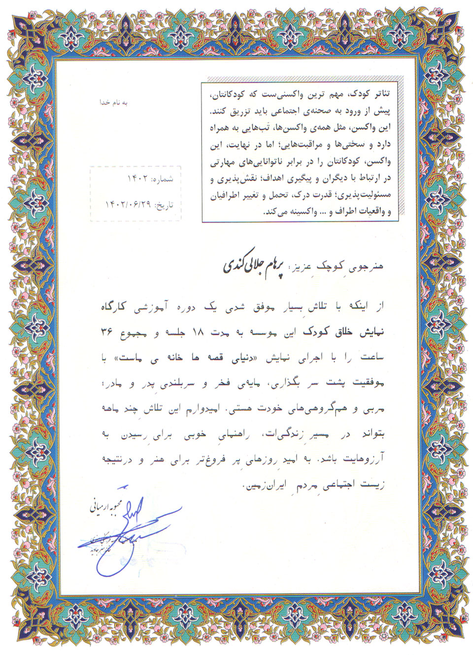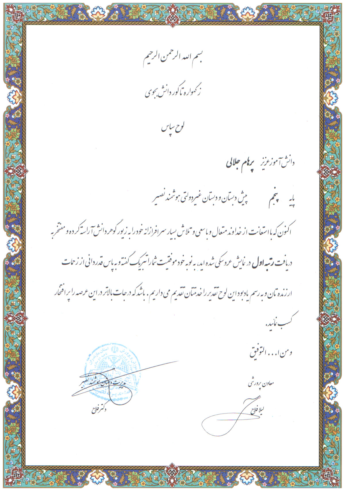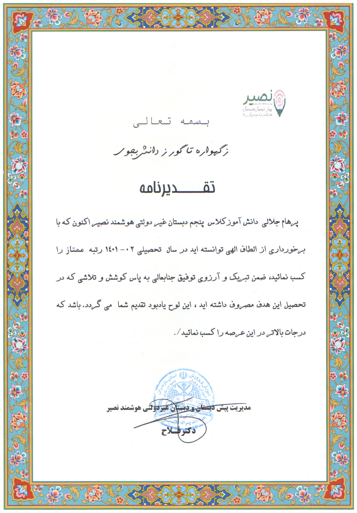 من کلاس اول و دوم دبستان را در مدرسه فرهنگ تحصیل کردهام. از کلاس سوم با توجه به امکانات و قابلیت های مدرسه نصیر با مدیریت جناب آقای دکتر فلاح، مدرسه نصیر را برای ادامهی تحصیل انتخاب کردم.